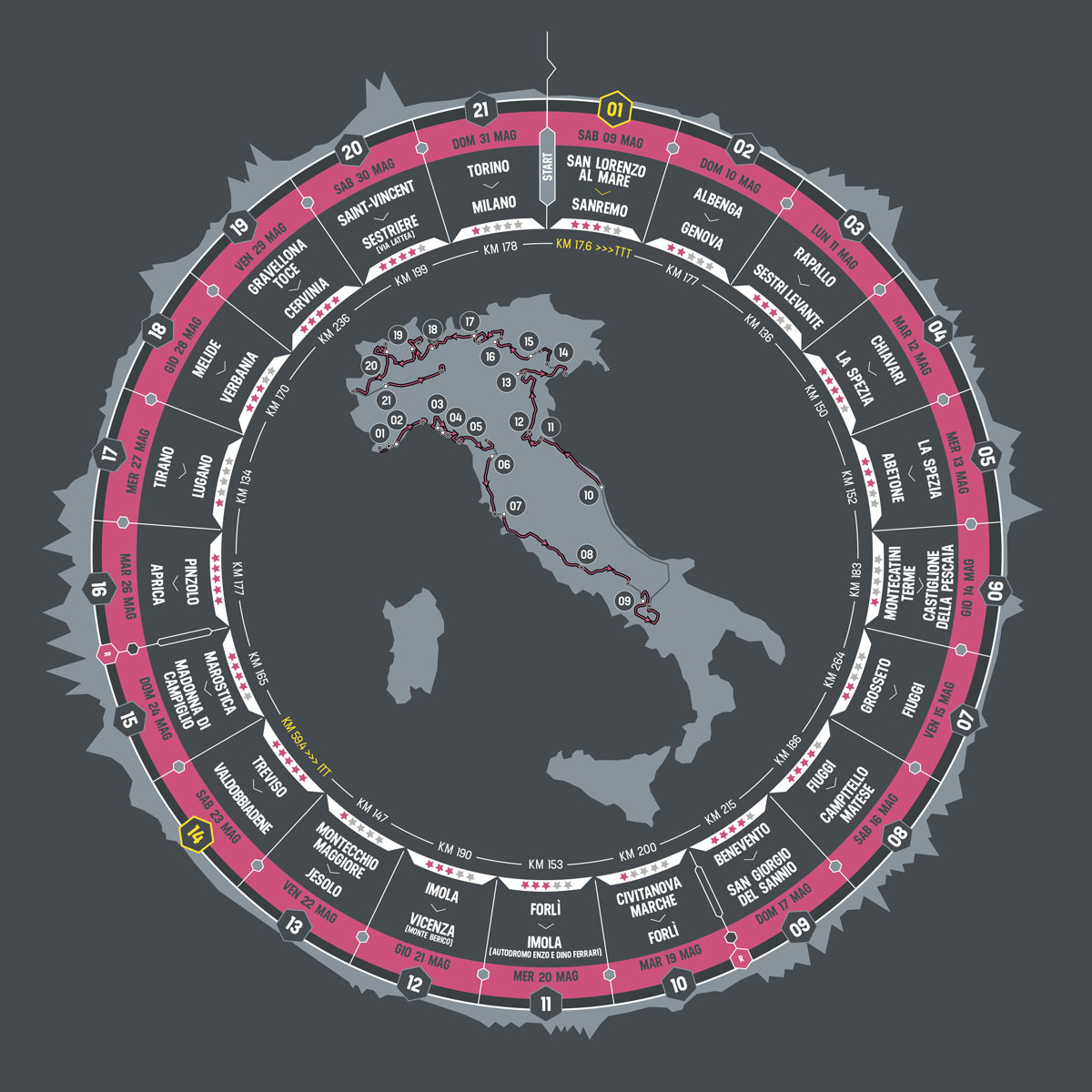 Why to watch: The Giro rolls into the Emilia region and the riders are greeted by the first summit finish of the race. Shouldn't be a huge GC battle but worth watching as someone will lose time and PhilGil and Mathews might get a chance to go head to head again. Who to watch: How fast do the climbers go up the final climb. Look for BMC and Orica to try to control for JillBear and Bling, then they can watch as Diego (puff the magic dragon) Ullisi takes the win.